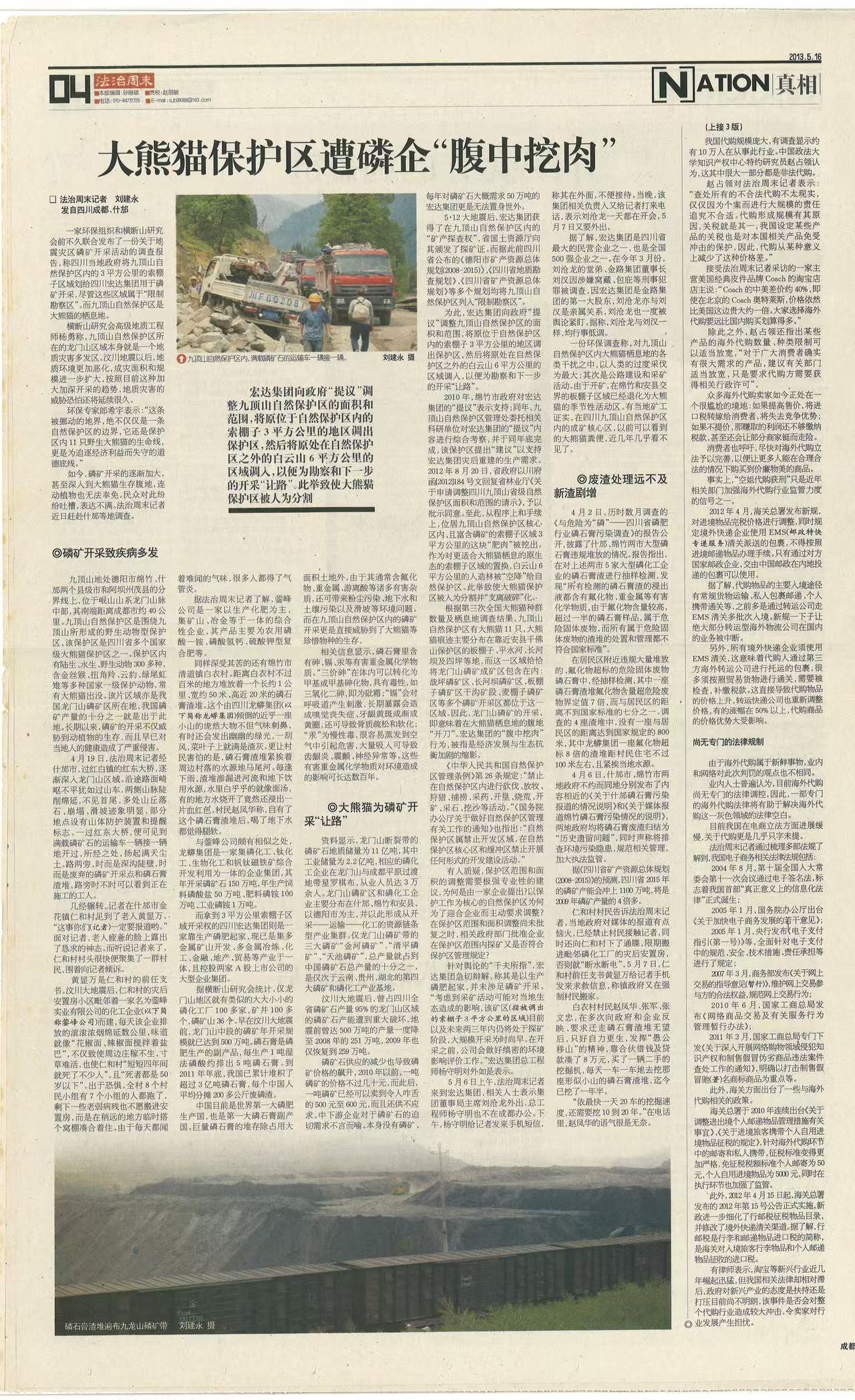 一家环保组织和横断山研究会前不久联合发布了一份关于地震灾区磷矿开采活动的调查报告,称四川当地政府将九顶山自然保护区内的3平方公里的索棚子区域划给四川宏达集团用于磷矿开采,尽管这些区域属于“限制勘察区”。而九顶山自然保护区是大熊猫的栖息地。