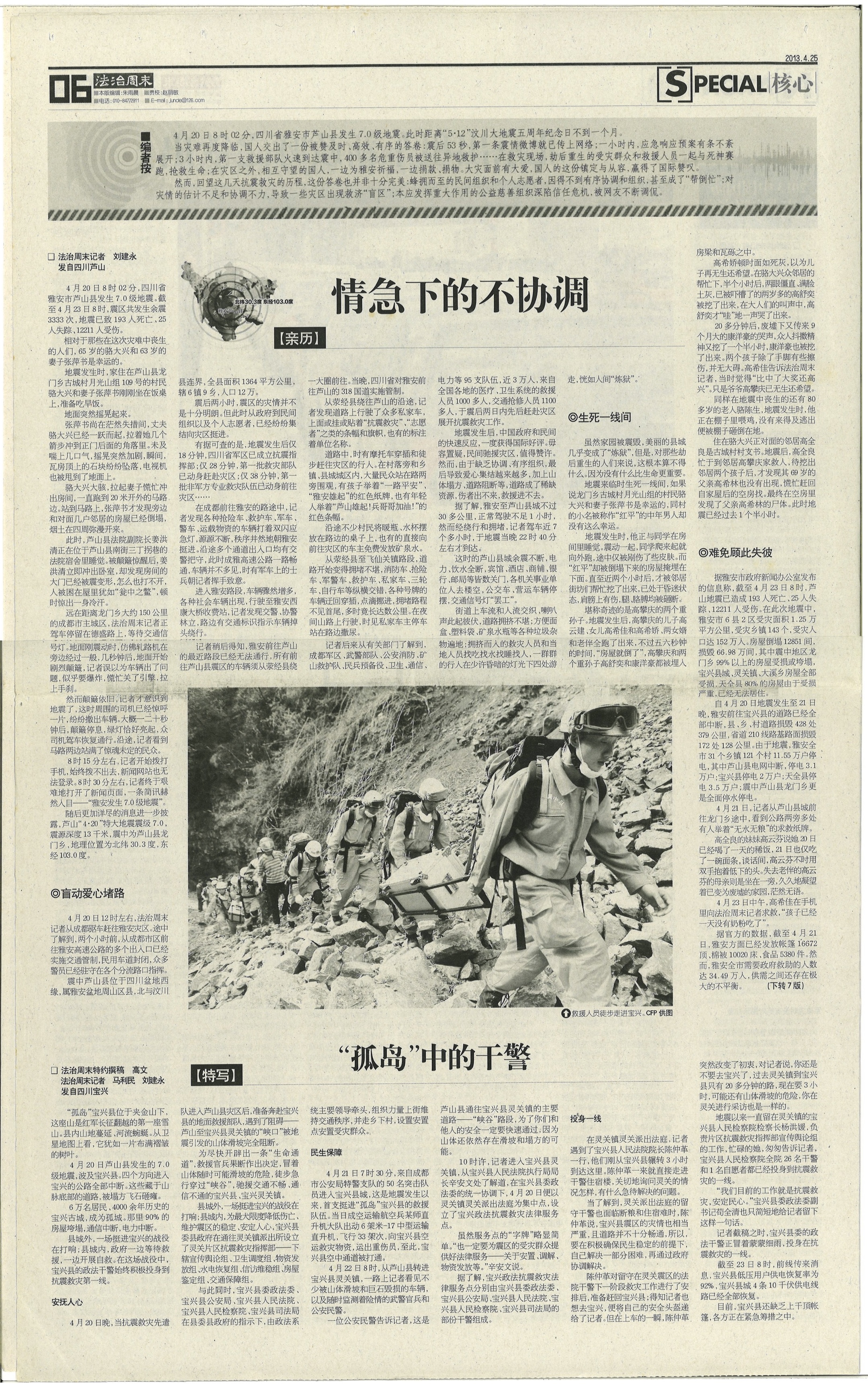 4月20日8时02分,四川省雅安市芦山县发生7.0级地震。此时距离“5•12”汶川大地震五周年纪念日不到一个月。
