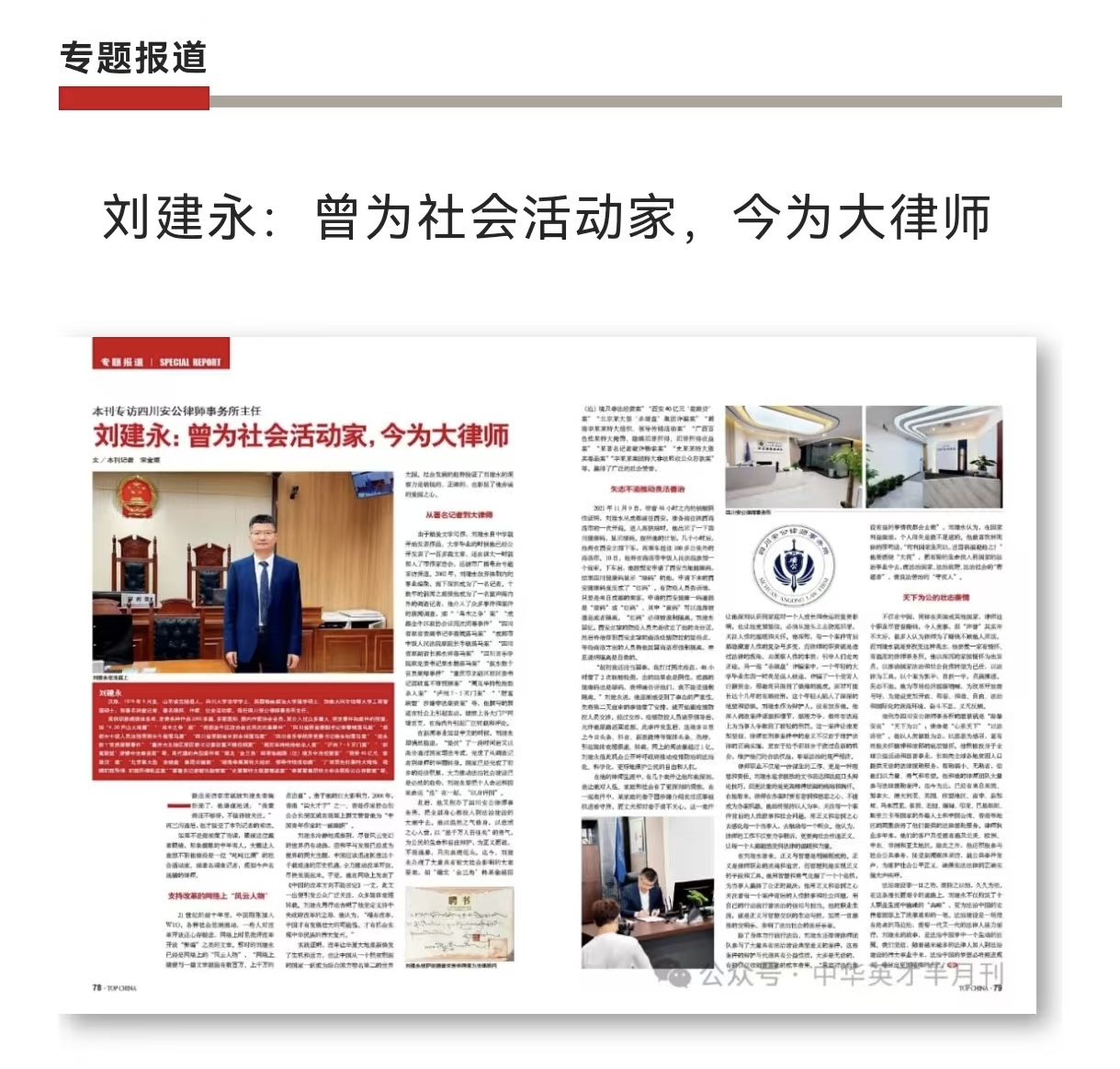 2024年11月1日,四川安公律师事务所主任刘建永教授接受《中华英才》杂志社副社长、中华英才半月刊网刊总编辑、高级记者宋金甫先生专访。 |